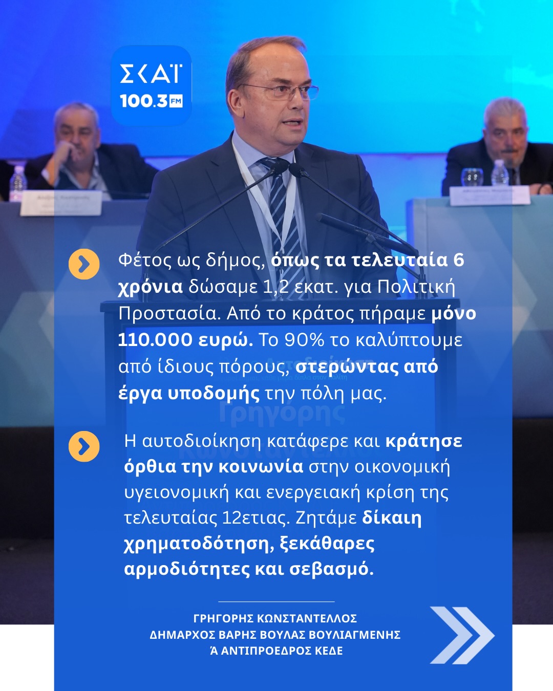 Στον ΣΚΑΪ, με τους δημοσιογράφους Βασίλη Χιώτη και Νότη Παπαδόπουλο, καλεσμένος ήταν ο δήμαρχος Βάρης Βούλας Βουλιαγμένης, κ. Κωνσταντέλος, ο οποίος όμως μίλησε ως Α’ Αντιπρόεδρος της ΚΕΔΕ, αναδεικνύοντας τα φλέγοντα ζητήματα που απασχολούν την Τοπική Αυτοδιοίκηση.